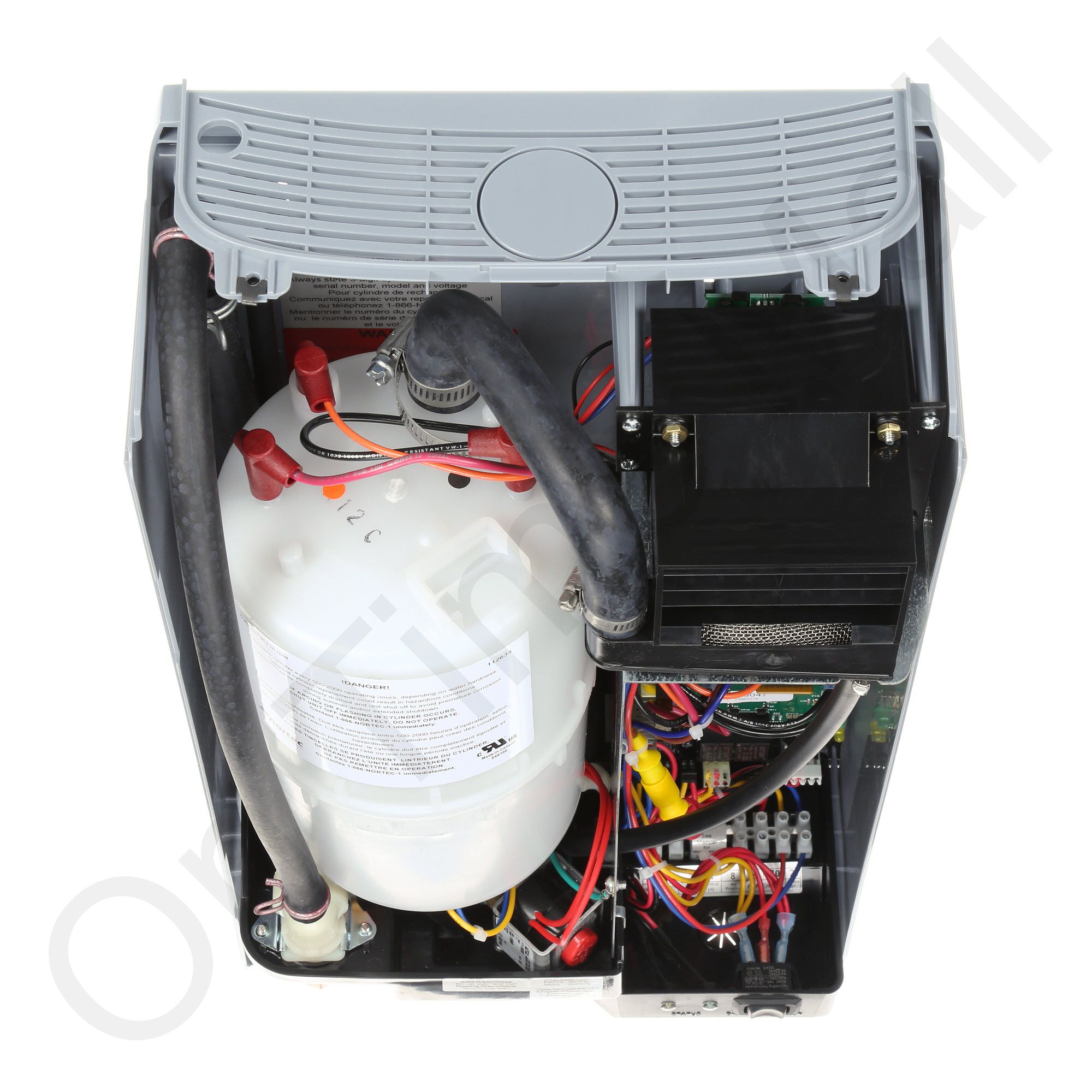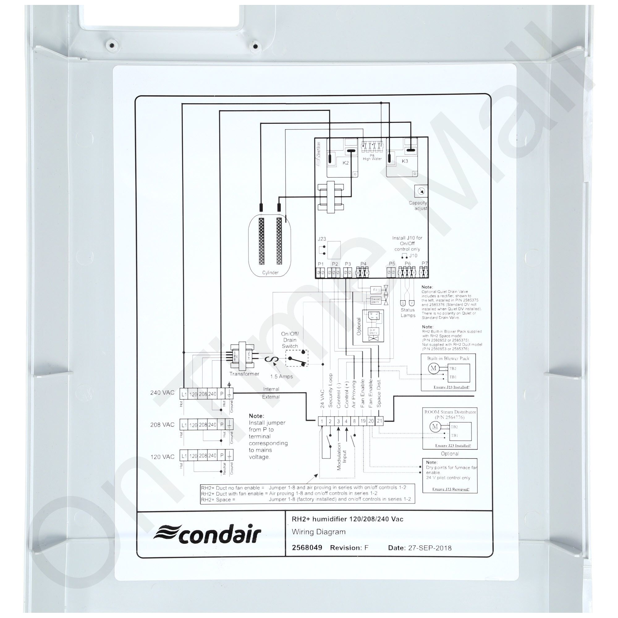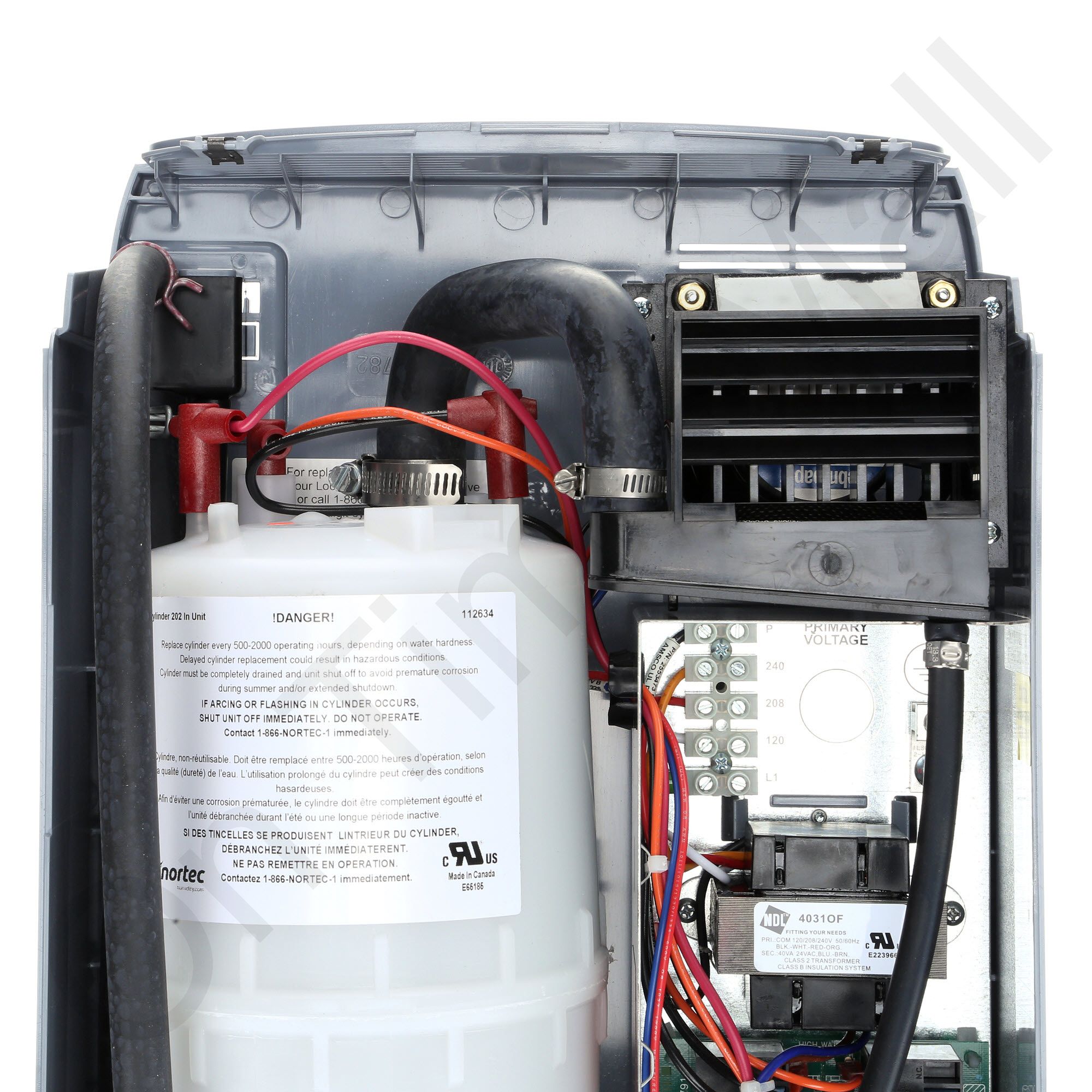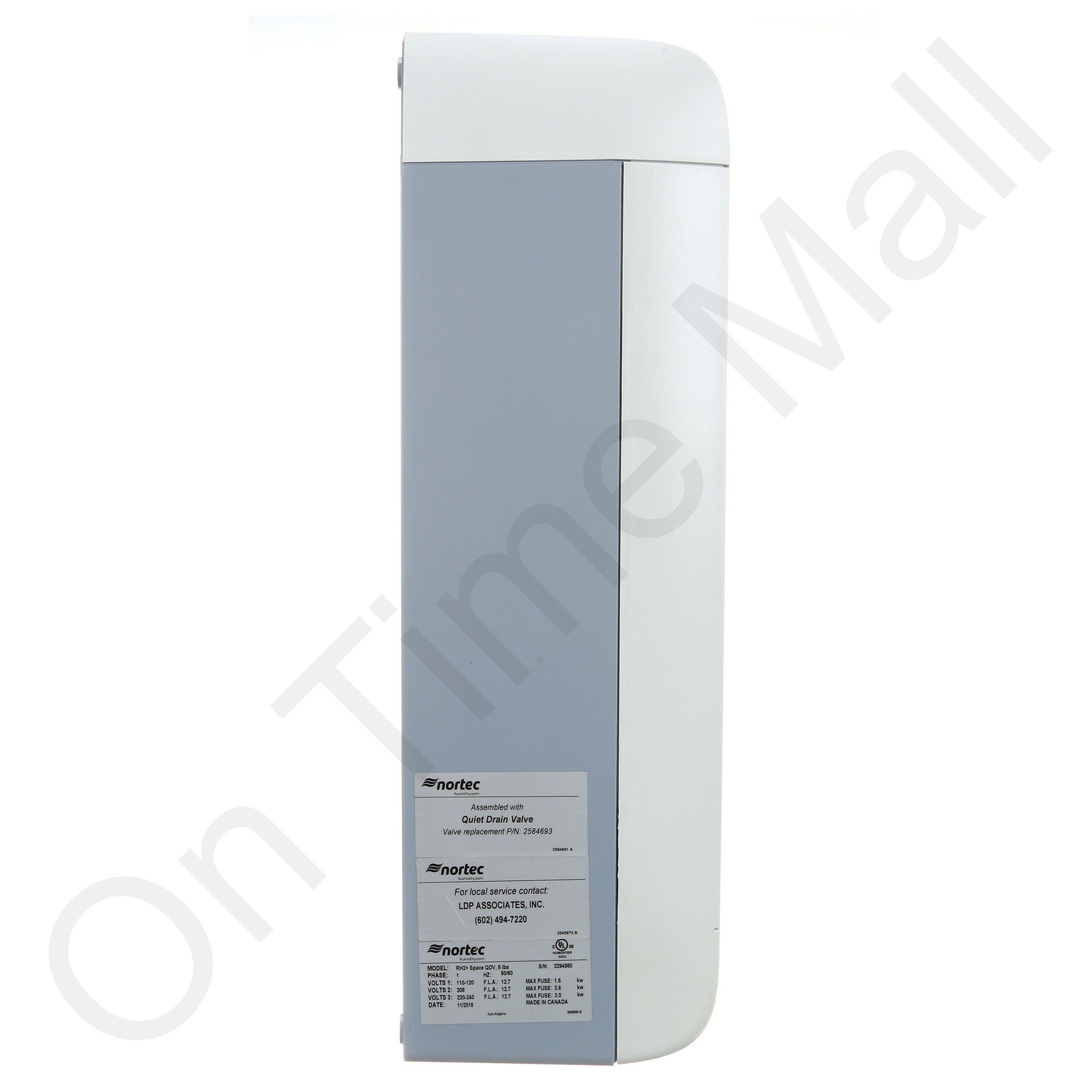 Nortec RH2+ Space Style 258-5378 Humidifier. This is the entire steam humidifier. It operates on 110 or 240 volts single-phase power. Normally this model is bolted to the wall and discharges the steam directly into the room via its built-in fan. Also known as part 254-8758. The humidistat is sold separately and available from us.