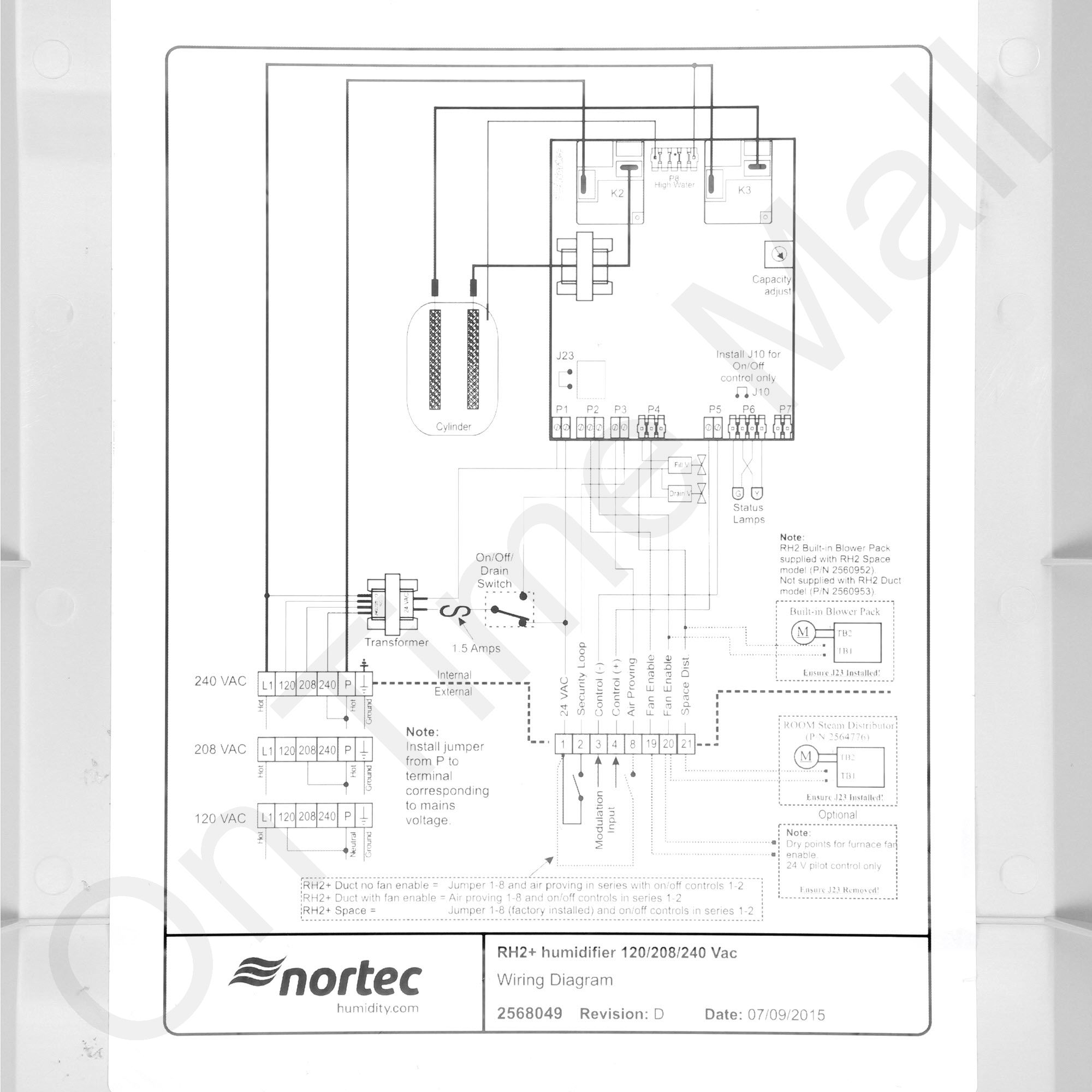 Nortec RH2 Duct Style 258-5376 Humidifier. This is the entire steam humidifier. It operates on 110 or 240 volts single-phase power. Normally this model is bolted to the wall next to your furnace or air handler and a steam hose is run from it to a steam nozzle that you install in the supply plenum. Steam hose, steam nozzle, humidistat, etc... are sold separately and available from us